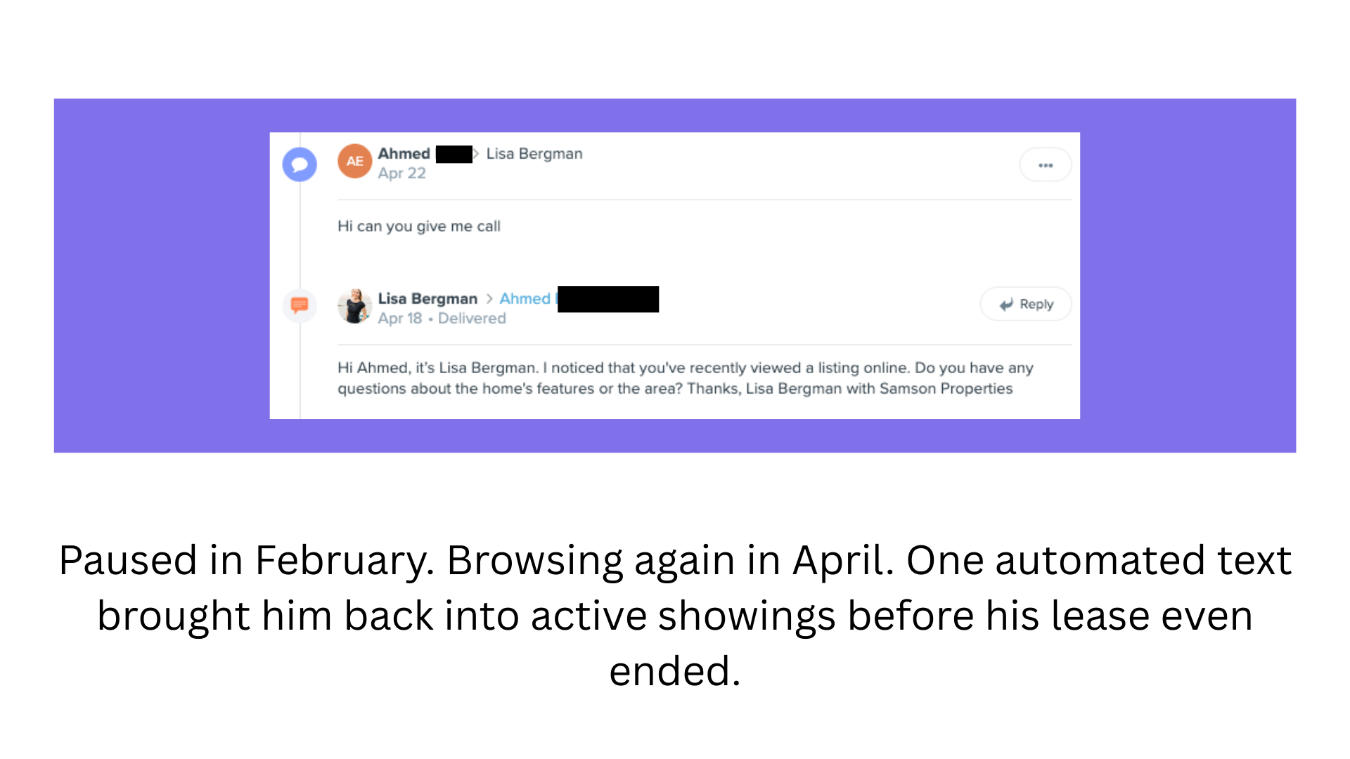 In December, a buyer lead named Ahmed was actively searching for homes but decided in February to pause until his lease ended. In April, he started browsing the agent's website again and responded to an automated KTS Back to Website text. He decided to start viewing homes before his lease ended and is now actively touring properties.