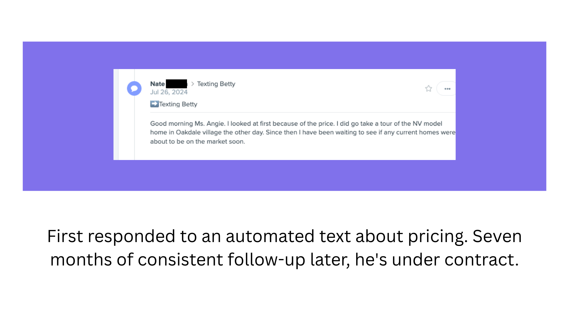Nate responded to a Back to Website text about a property he'd viewed because of the price. The agent sent more listings, called to gather details, and continued showing homes from September through April. Nate is now under contract.