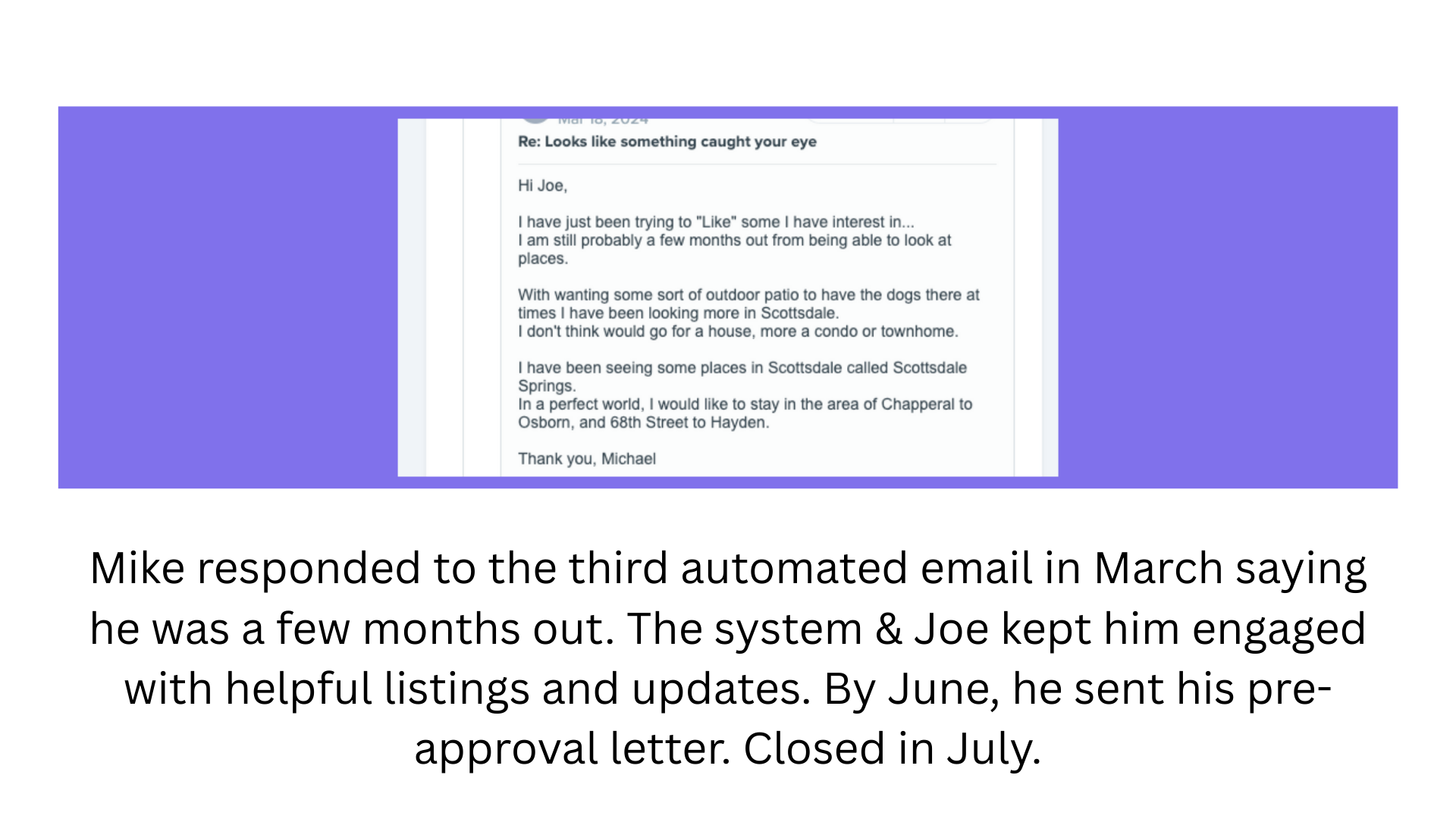 March 18, 2024: Mike responds to automated email, says he's interested but a few months out. Mentions wanting outdoor space for his dogs. Prefers Scottsdale area, specifically around Chapperal to Osborn, 68th Street to Hayden.